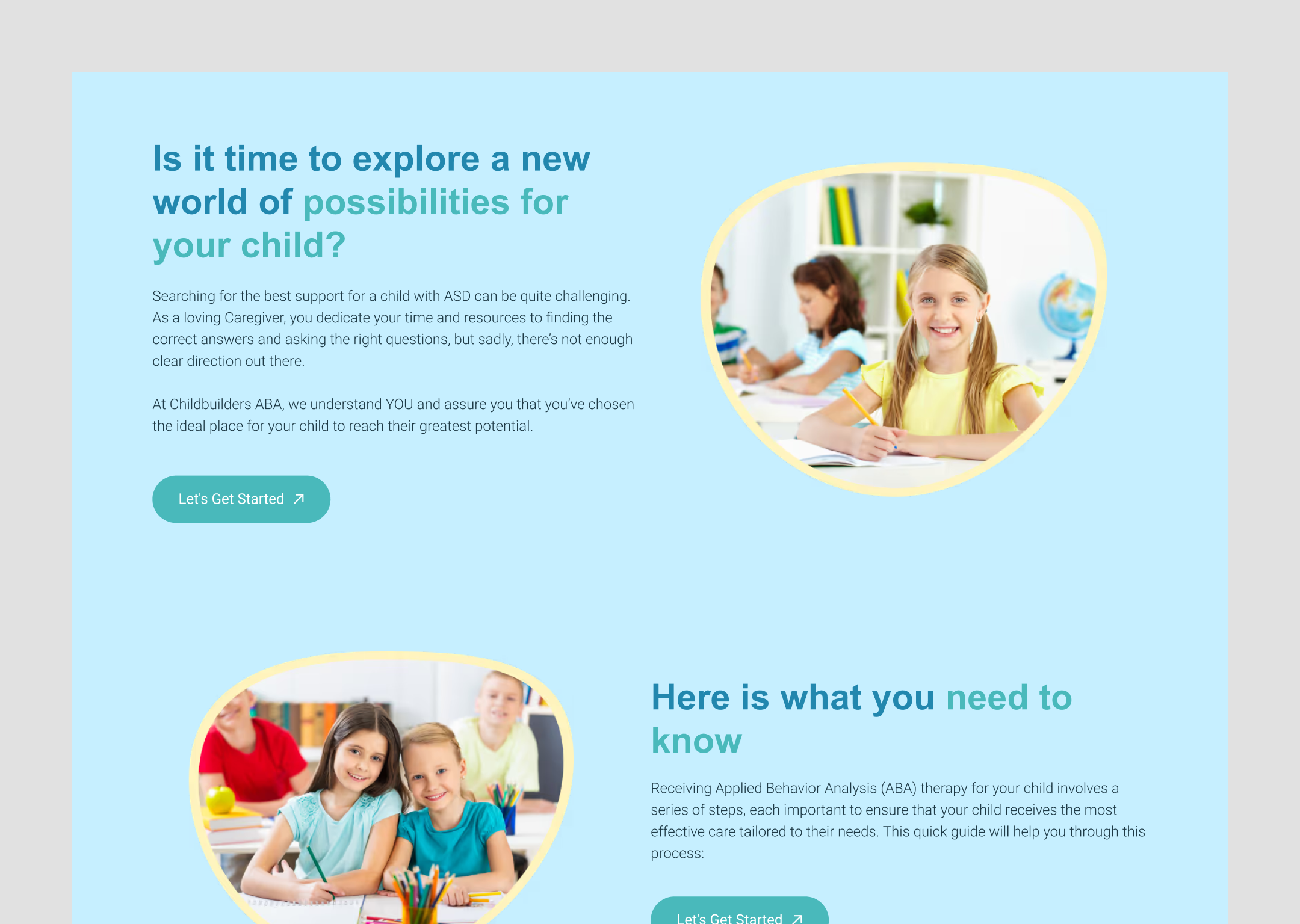 Empathy-First Messaging: The core content strategy was built on deep emotional intelligence. Rather than opening with credentials or services, we led with validation: "Searching for the best support for a child with ASD can be quite challenging. As a loving Caregiver, you dedicate your time and resources to finding the correct answers and asking the right questions, but sadly, there's not enough clear direction out there." This acknowledgment of struggle was strategic—it immediately signaled to parents that ChildBuilders understood their experience.