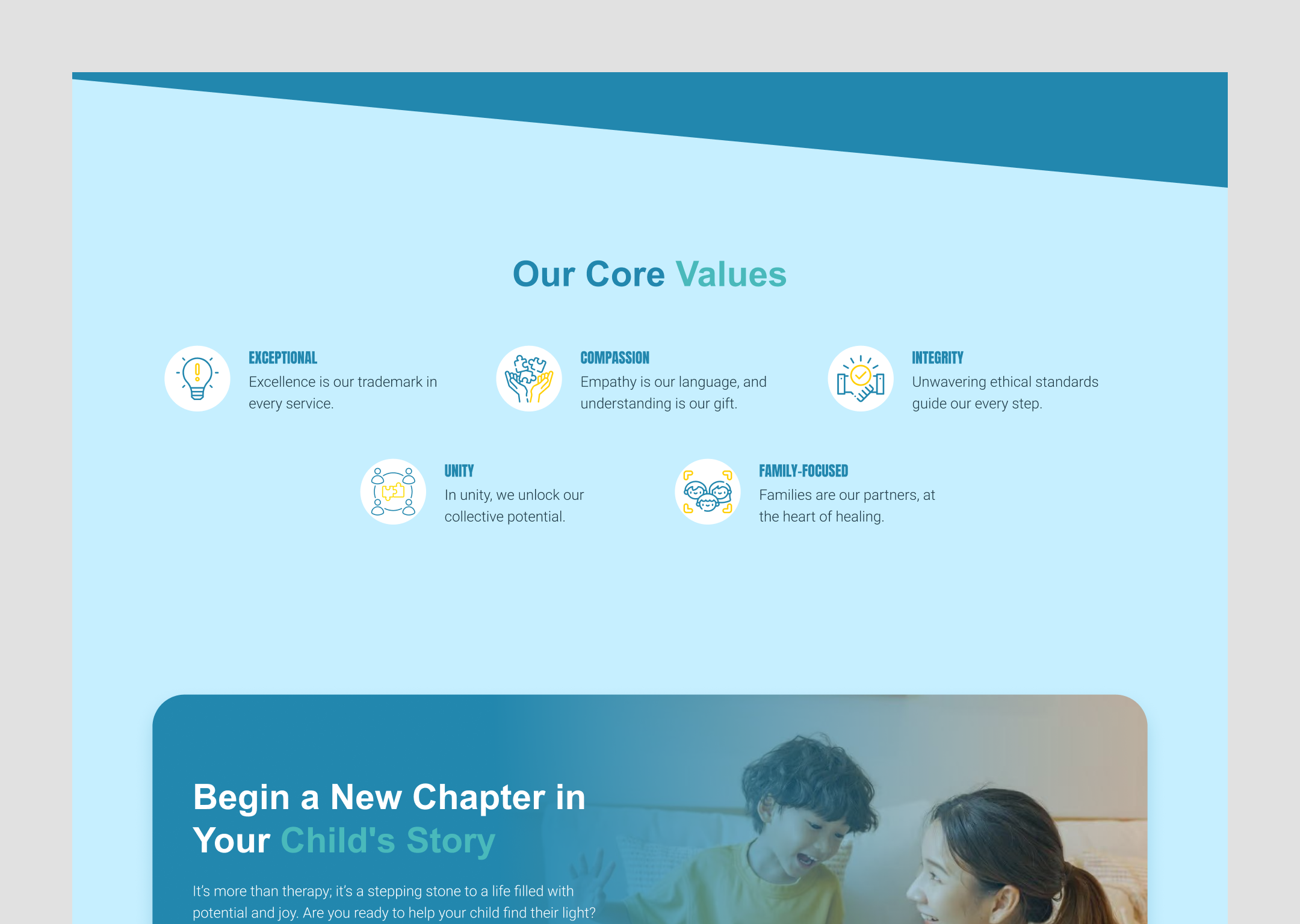 Values as Emotional Promises: The core values section wasn't corporate boilerplate—it was a series of emotional commitments. "Compassion: Empathy is our language, and understanding is our gift" and "Family-Focused: Families are our partners, at the heart of healing" reinforced that ChildBuilders saw families as whole people with emotions, not just clients with needs.