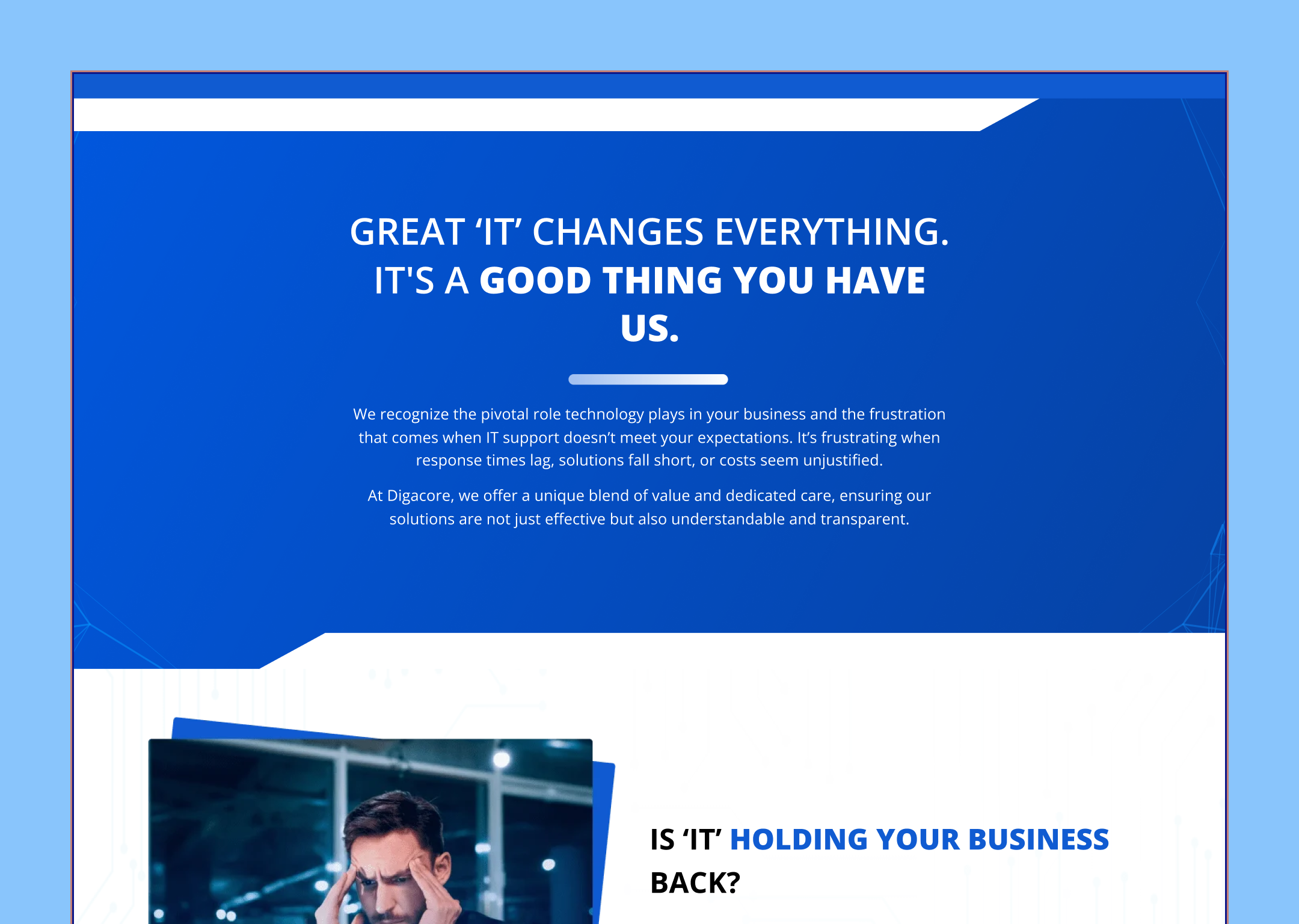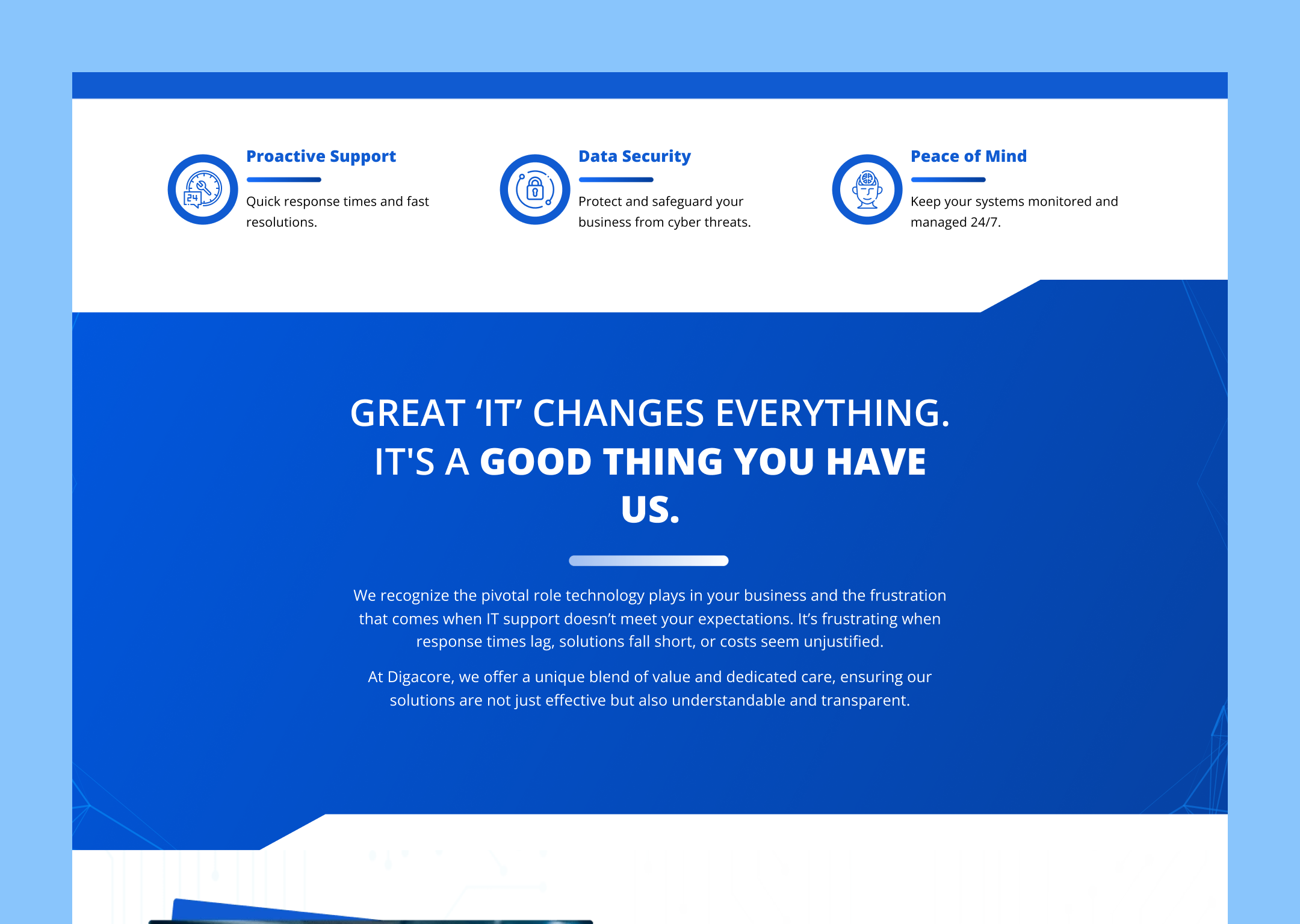 The objective of this project was to revamp Digacore’s website content to clearly communicate its value as a dependable, proactive IT partner for businesses. The goal was to replace overly technical or generic messaging with clear, benefit-driven content that quickly explains what Digacore does, who it serves, and why businesses should trust them with their technology infrastructure.