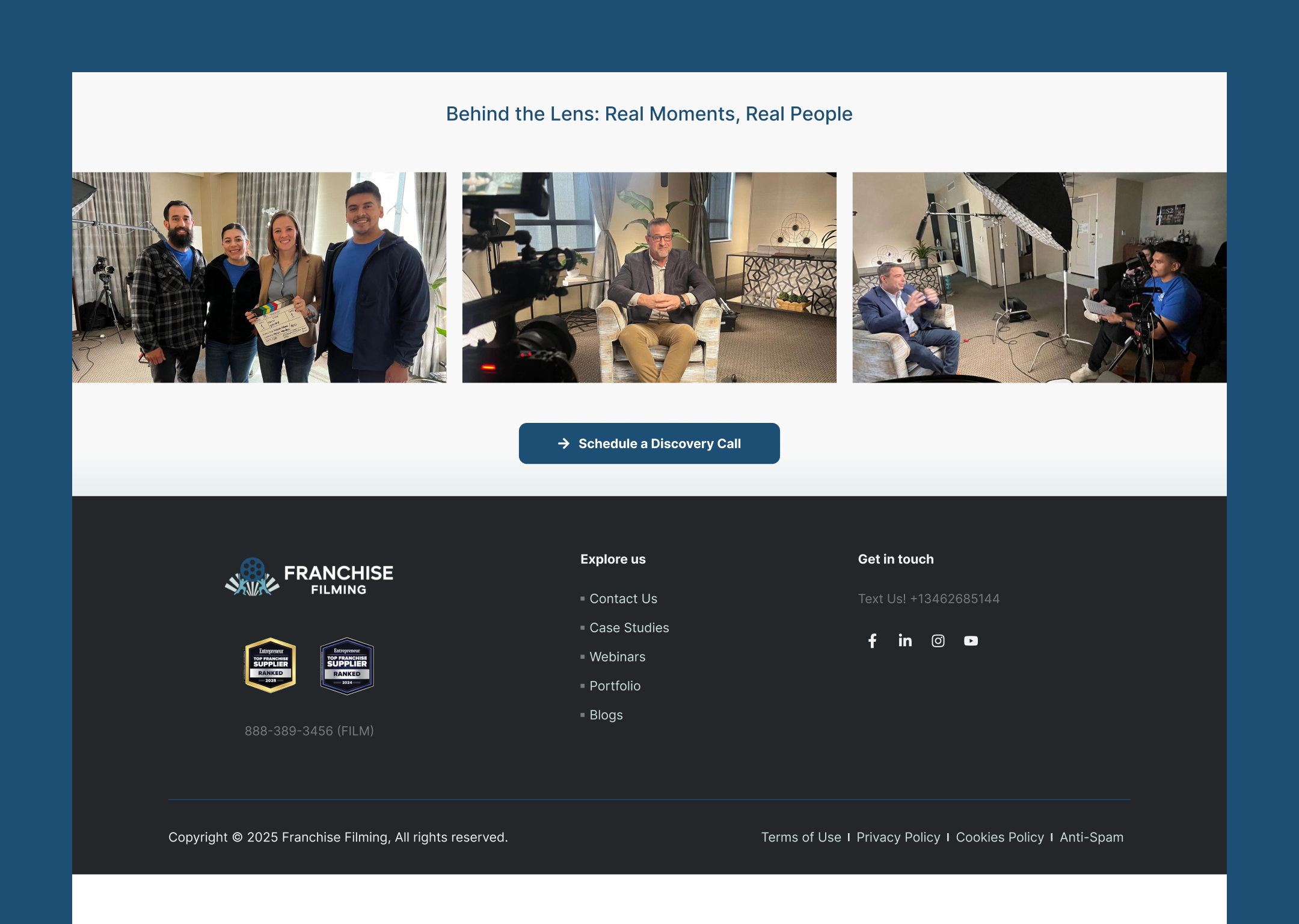 Service Architecture Clarity: We reorganized the service menu from vague categories into specific, outcome-oriented offerings that franchise teams immediately recognized: Franchise Development Videos, Grand Opening Videos, Training Videos, Annual Conference Coverage, Franchise Leadership Videos, and Umbrella Brand Solutions. Each category spoke to a specific use case in the franchise lifecycle, making it immediately clear that Franchise Filming understood the franchise business model deeply.