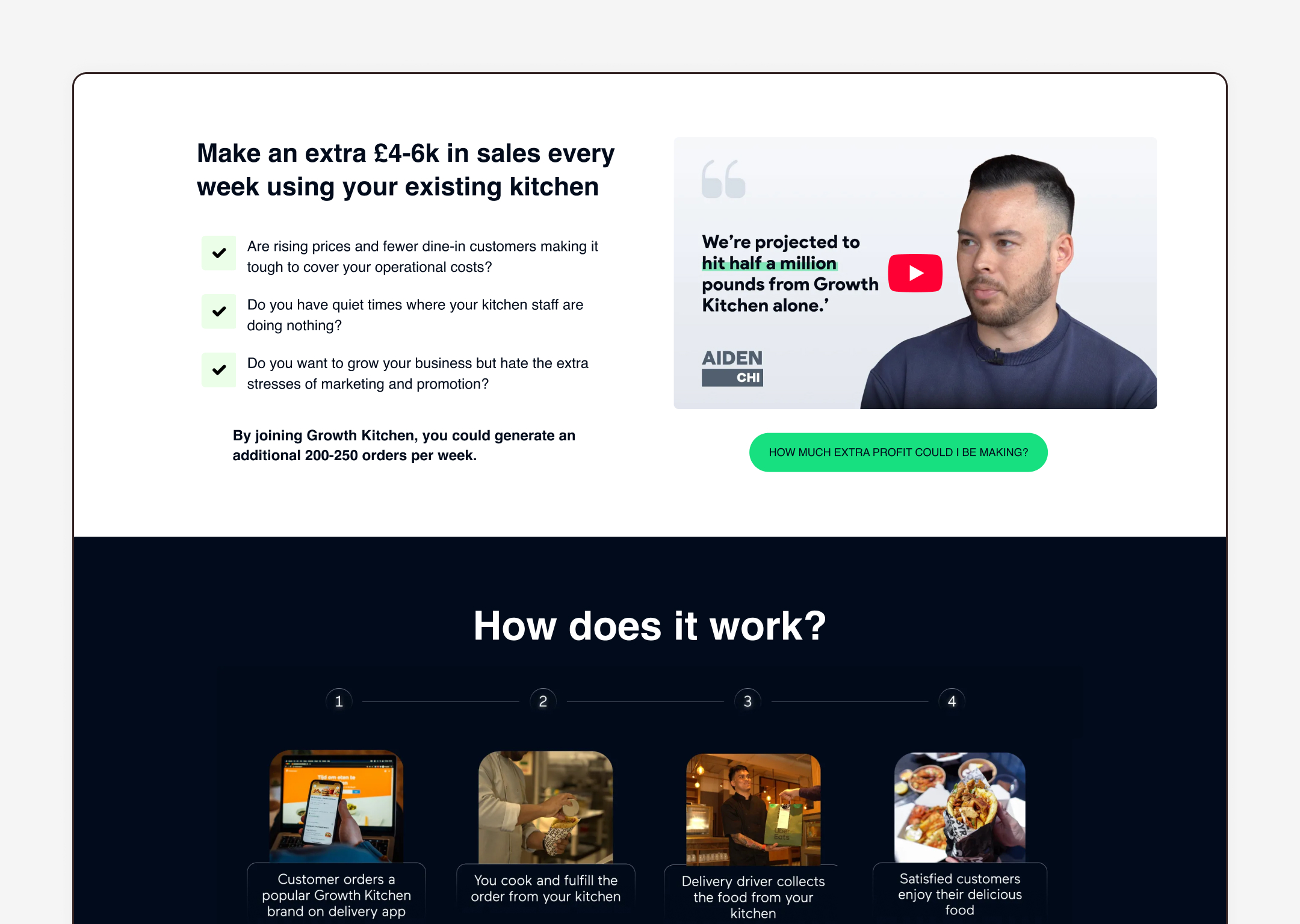 Financial Transparency as Trust Builder: Rather than hiding the economics, we made them the centerpiece. Copy explicitly stated "Make an extra £4-6k in sales per week" and broke down profit margins (18-20%), timeline to profitability (£2,000+ by week 4), and upfront costs (£900 for initial stock). This radical transparency was strategic—it pre-qualified leads and built trust by demonstrating Growth Kitchen had nothing to hide.