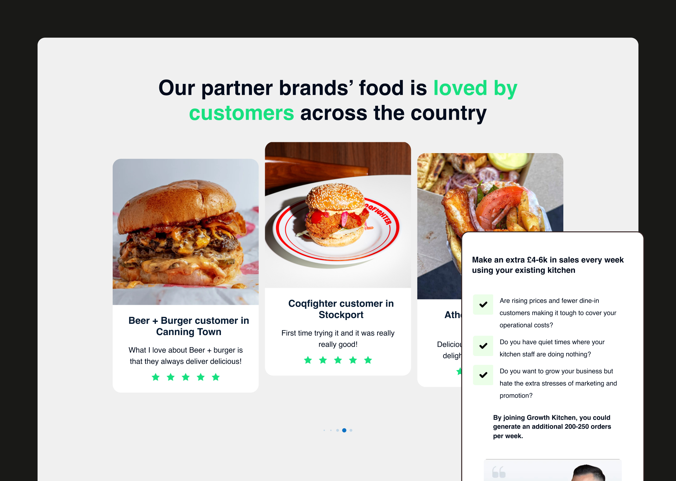 Trust-Building Visual Elements: We incorporated real brand logos prominently (Coqfighter, The Athenian, Beer + Burger), delivery platform badges (Uber Eats, Deliveroo, Just Eat), and location maps showing Growth Kitchen's UK-wide presence. These weren't decorative—they were strategic trust signals that communicated scale and legitimacy.